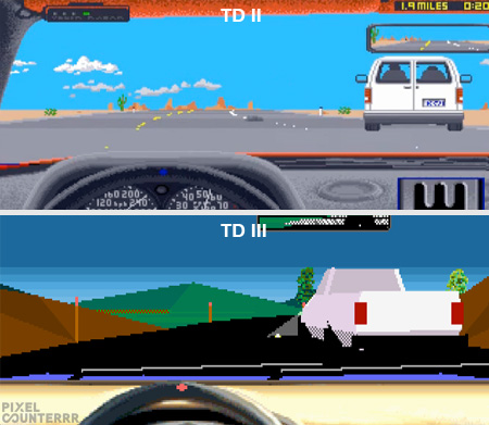 TD’s sequel, The Duel: Test Drive II released two years later, kept the graphics paradigm basically intact, but in 1990 Test Drive III: the Passion finally entered the realm of (jumpy) polygon-based imagery.