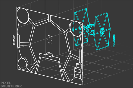 So, there’s an interesting parallel here in play which occurred to me when flying around in Star Wars: TIE Fighter (LucasArts, 1994) and reflecting the connection between the cockpit of the ship and the “outside world.” The visuals of TIE Fighter are basically a combination of two very different visual paradigms which are gouraud shaded polygons used to depict the external objects and plain bitmap graphics for the cockpit. One could say that the former represents 3D and the latter 2D, but as I wrote earlier, that dichotomy as such can be quite confusing and moot.