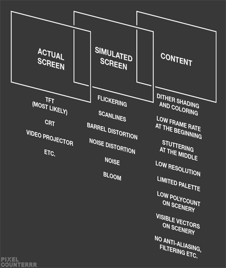 And finally there is the Actual Screen on which the imagery is displayed to the viewer, which is, of course, beyond artistic control. For what I know, someone could be indeed watching my animation even with a real CRT monitor, which would be interesting setting considering the animation attempts to simulate one.